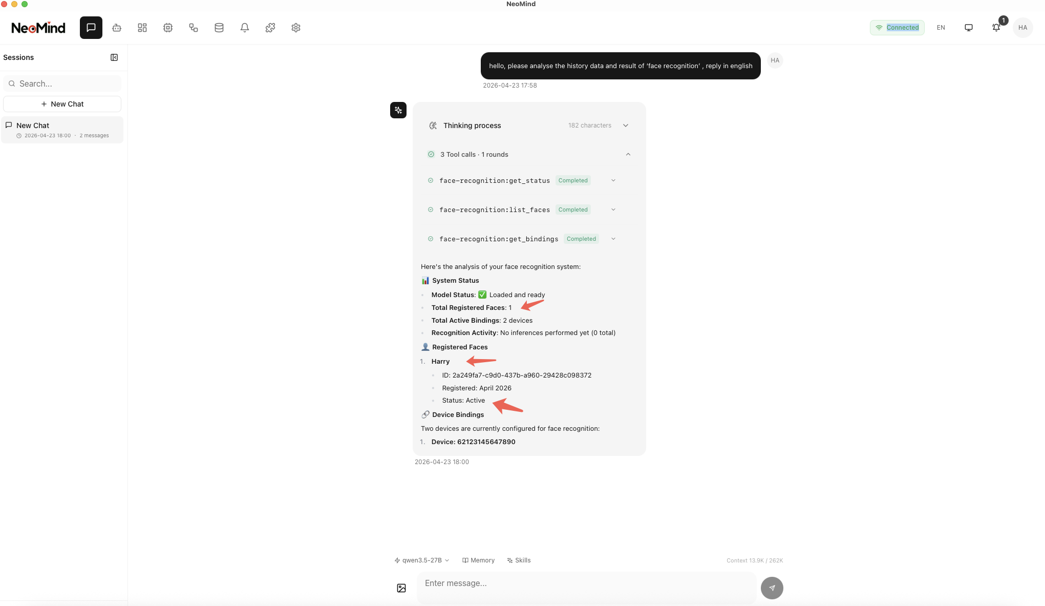 The Face Recognition plugin for NeoMind detects faces and identifies individuals from images captured by connected devices. Results are displayed in real-time on the dashboard and can also be queried using AI Chat via natural language.