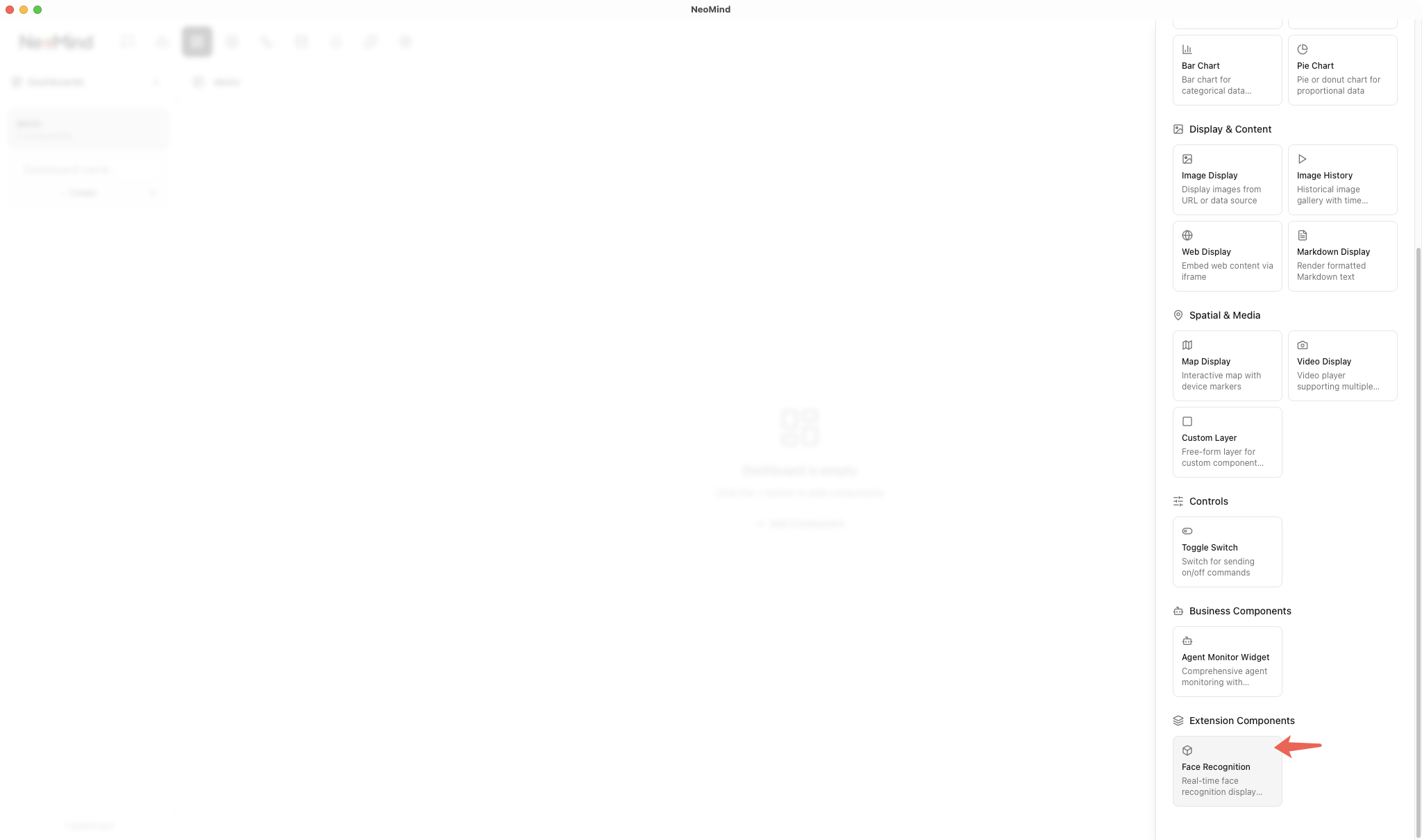 Go to the Dashboard management page, click Create Dashboard, then add a Face Recognition component: