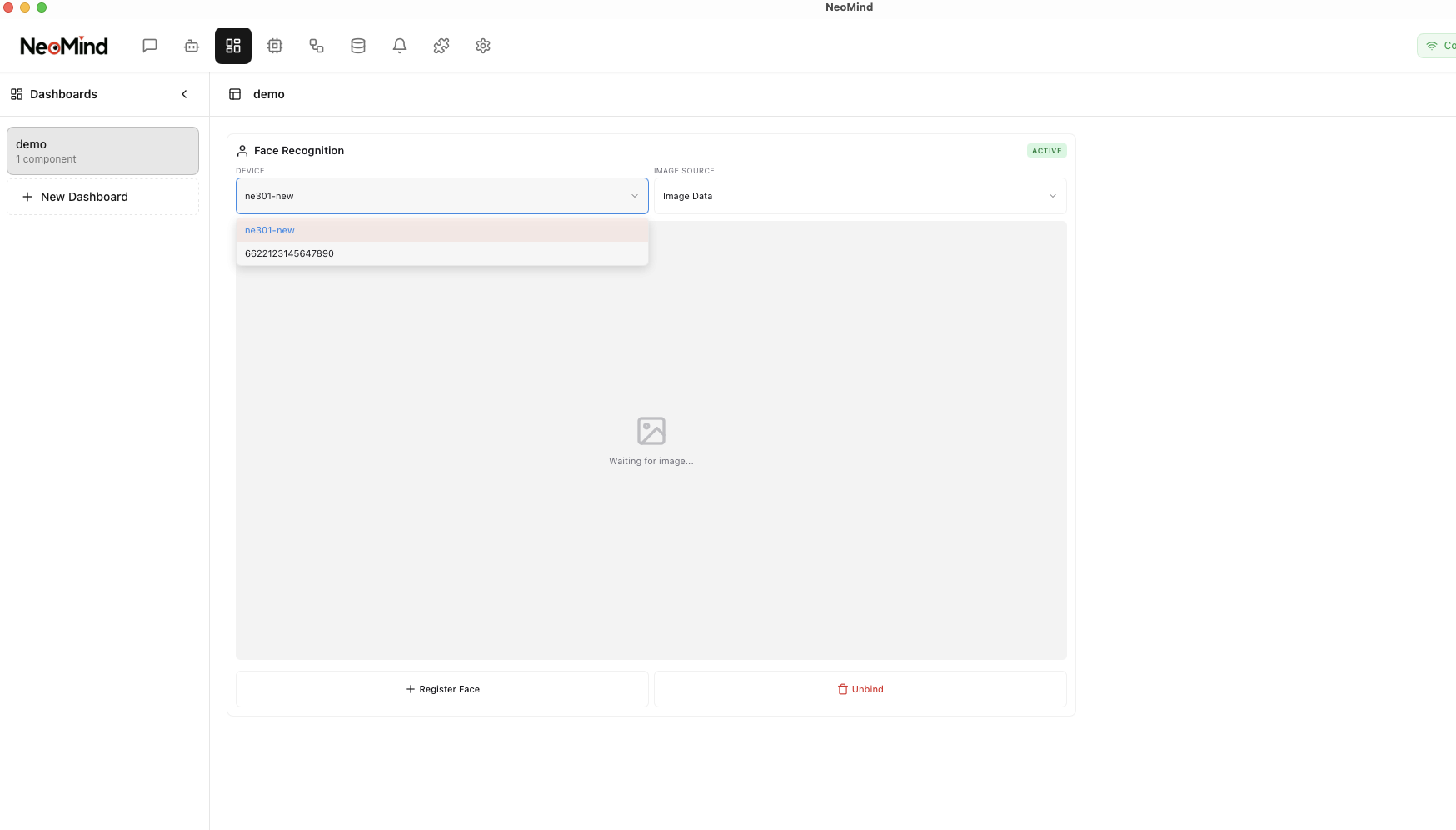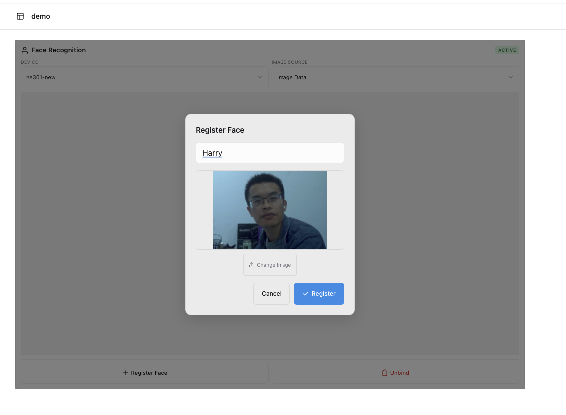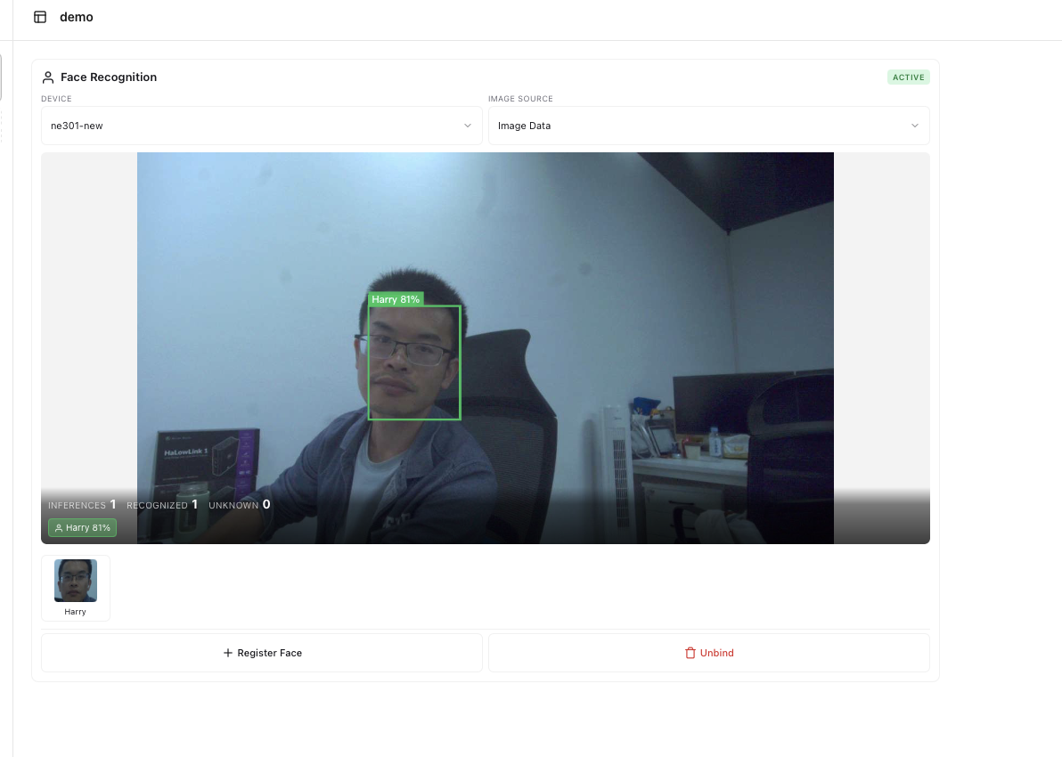Bind a target device (NE101 or NE301) to the Face Recognition component. Once bound, the component will automatically receive and process images captured by the device: