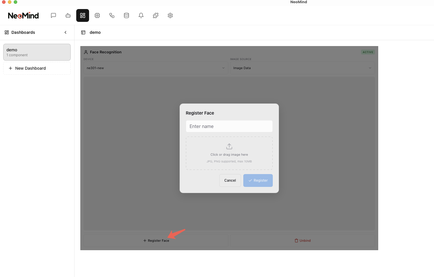 Before using the identification feature, you need to register faces to the face library. In the Face Recognition component, click Register Face, upload a clear frontal photo and fill in the corresponding identity information: