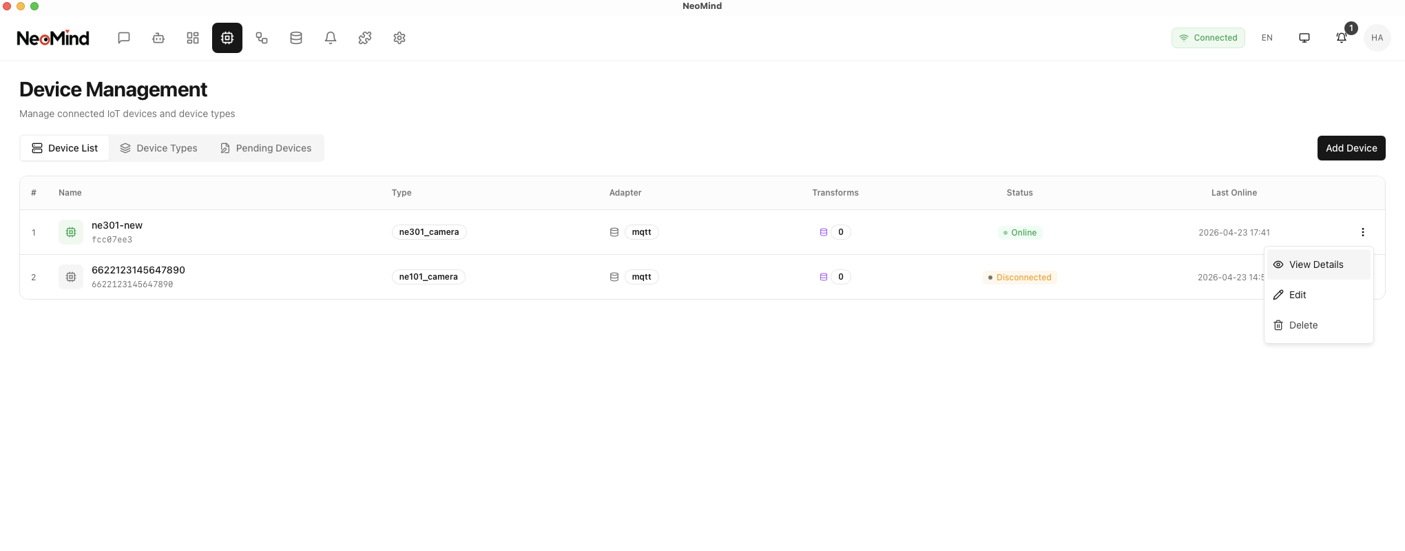 Register your NE101 or NE301 with the NeoMind platform. For detailed steps, refer to NeoMind Quick Start - Device Management.