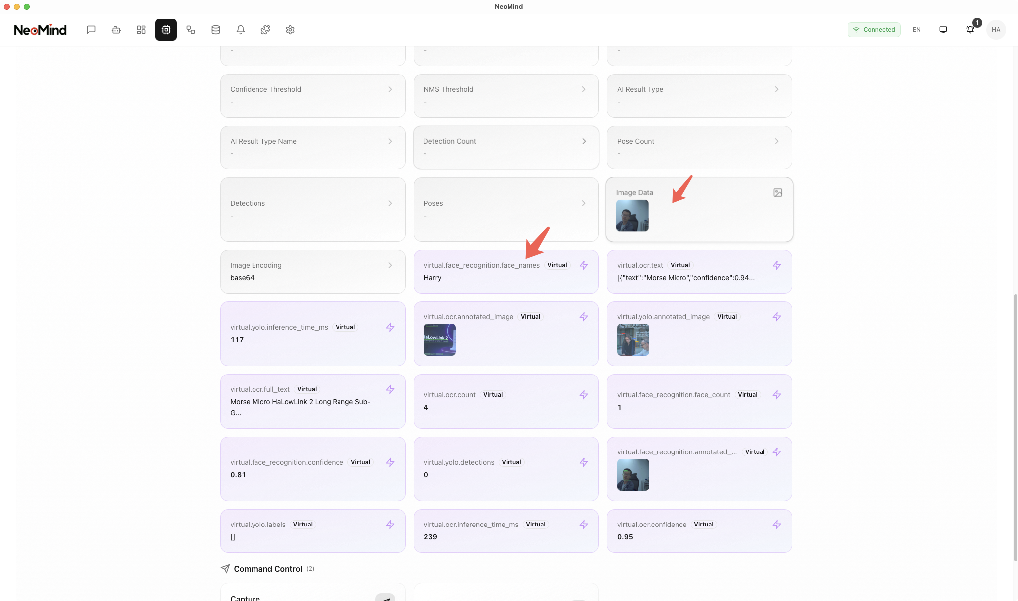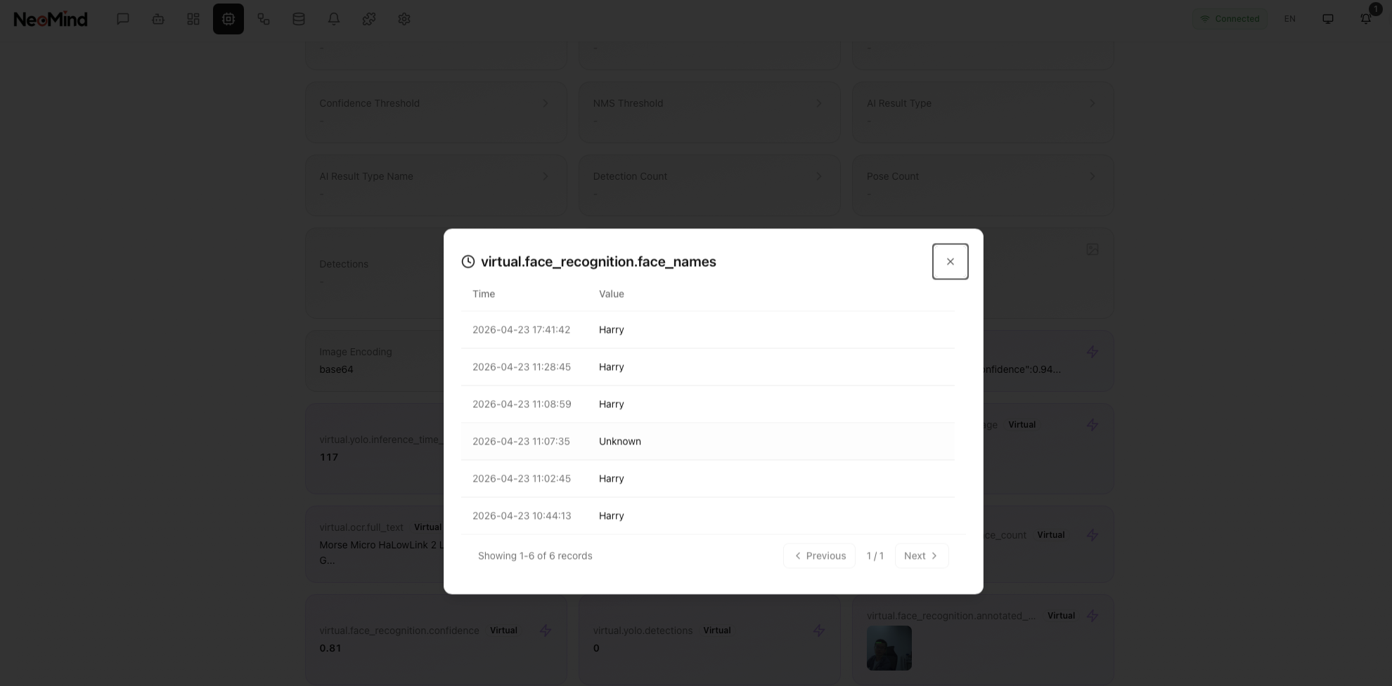 Once faces are registered, the plugin will automatically detect and identify faces when the device captures images. View real-time recognition results on the dashboard: