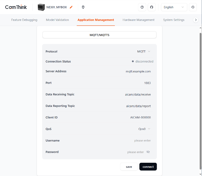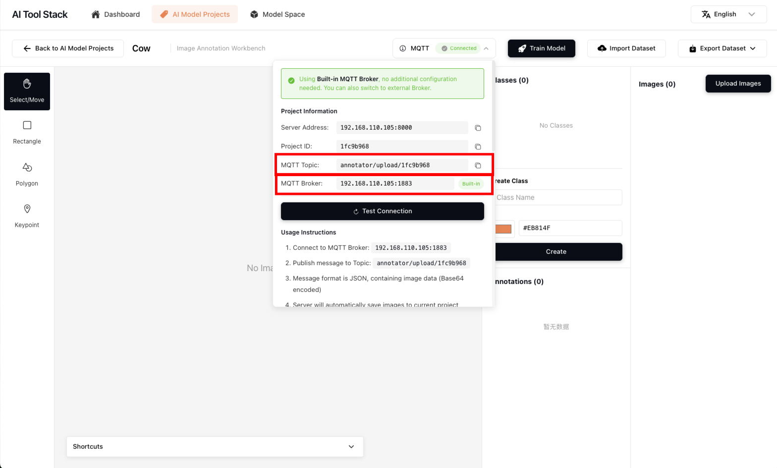 b. Configure NE301's MQTT service to enable NE301 to report currently collected image data to AI Tool Stack projects through MQTT. Enter NE301's "Application Management" menu, enter Data Reporting Topic and Server Address information to connect with AI Tool Stack's built-in MQTT service. AI Tool Stack can be obtained in the MQTT at the top of the project workbench, as shown in the figure below. After confirming the information is correct, you can click "connect" to connect NE301 to AI Tool Stack's specified model training project.