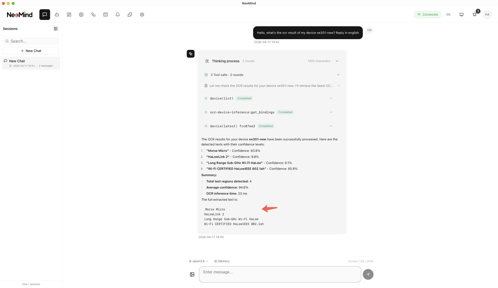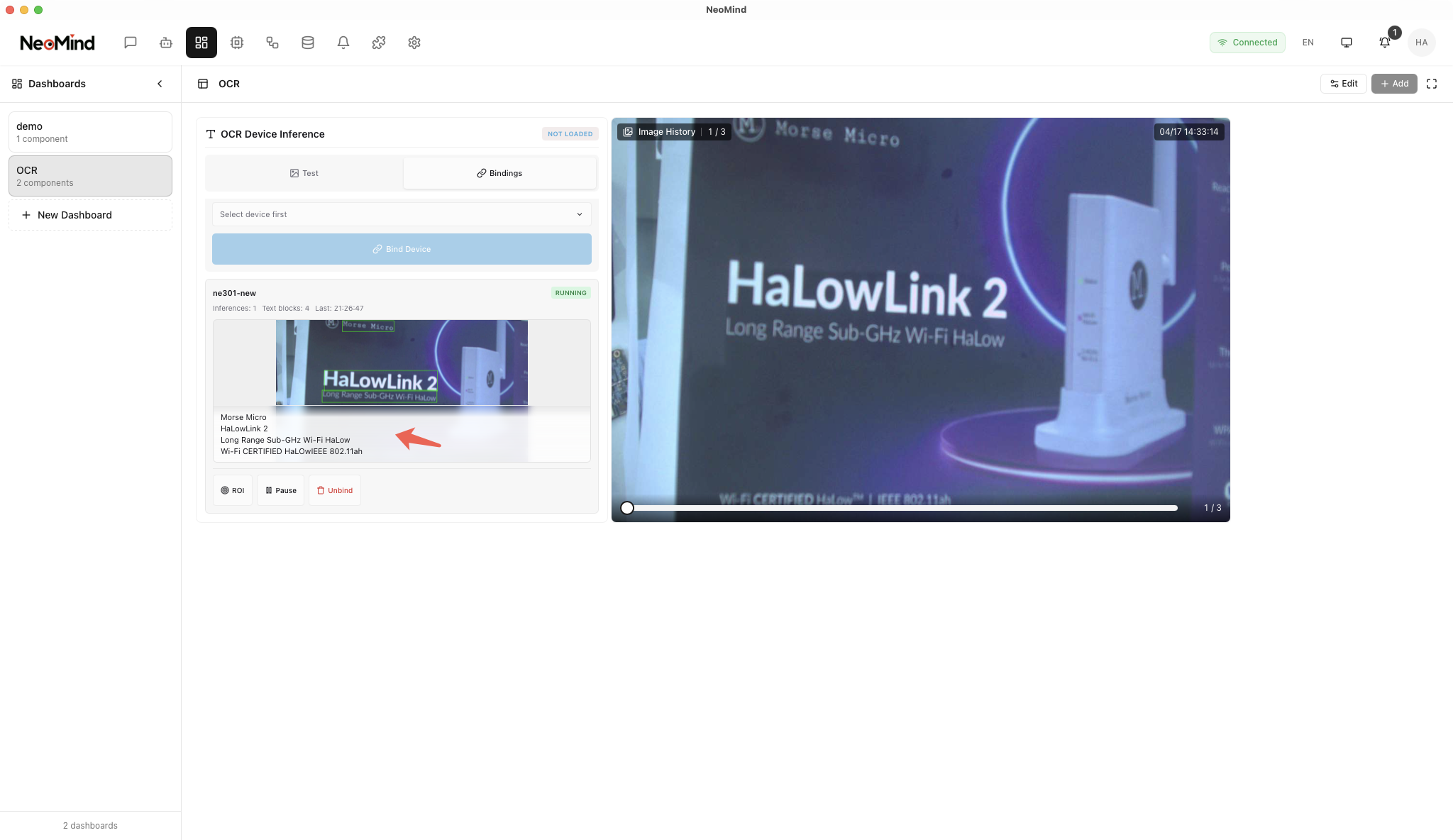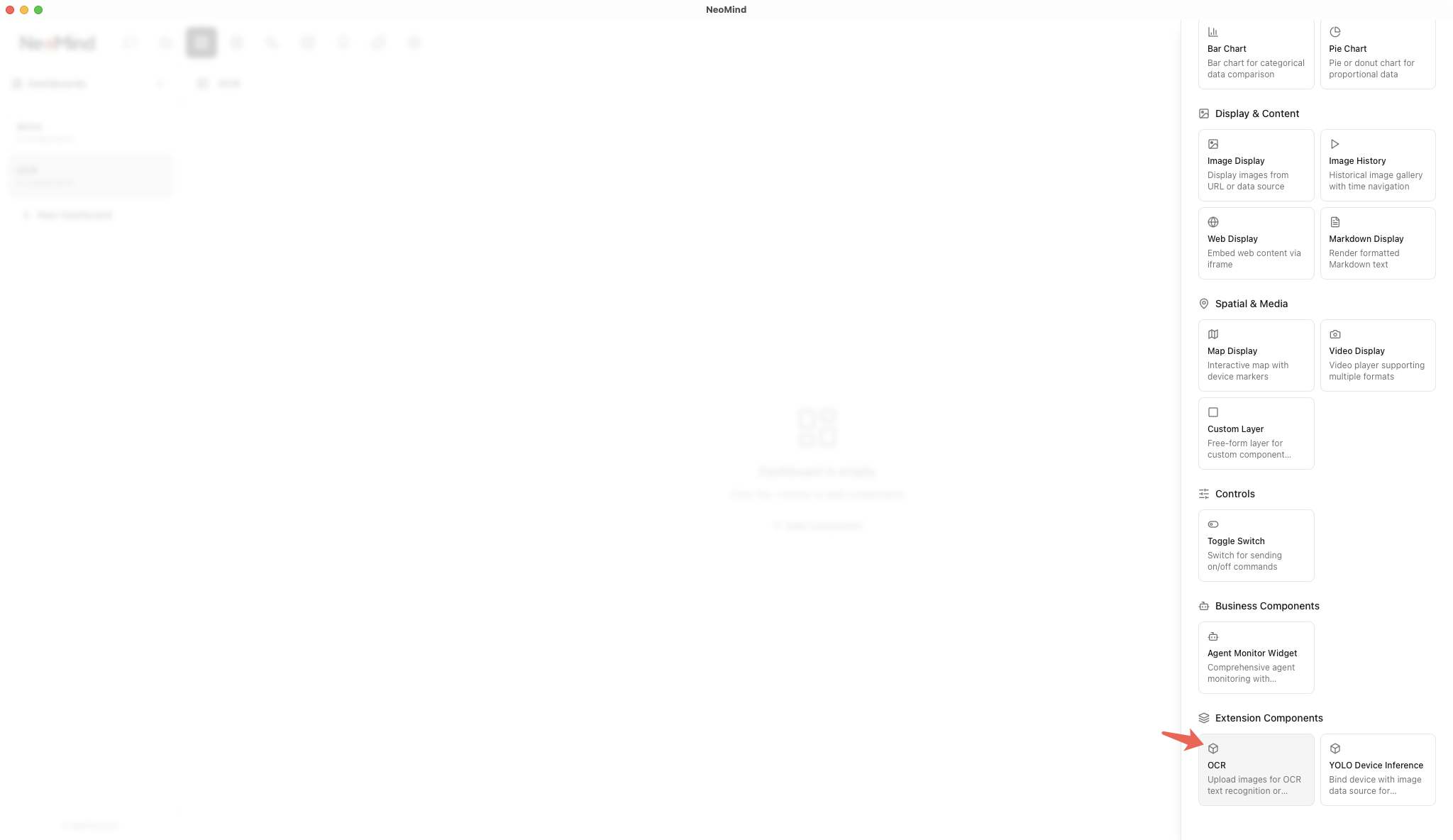 NeoMind 的 OCR 插件 可对设备采集的图像进行通用文字识别,提取图片中的文字内容并在仪表板中展示。识别结果还可通过 AI Chat 以自 然语言方式查询。