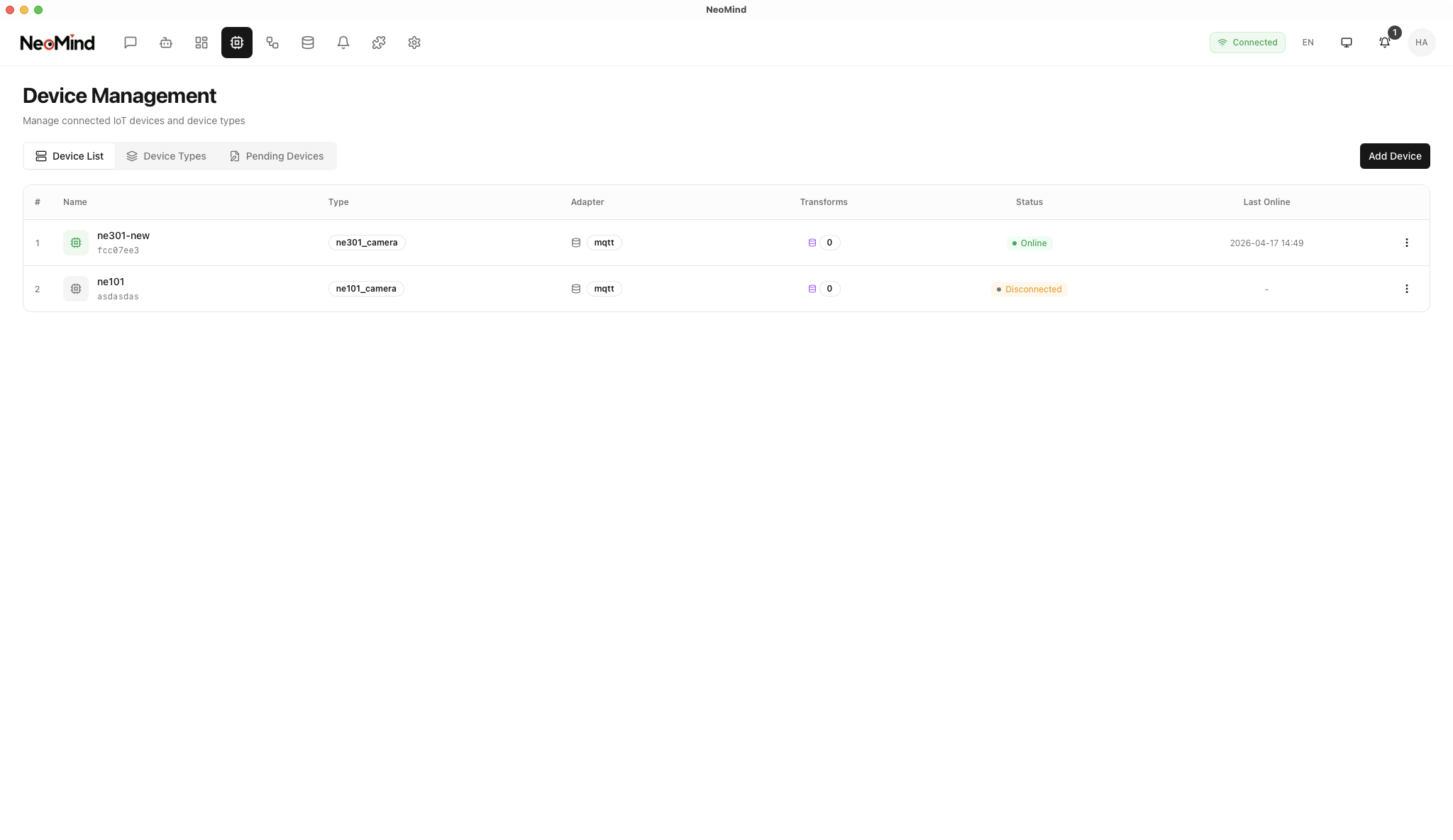 详细的设备接入步骤请参考 NeoMind 快速入门 - 设备管理。