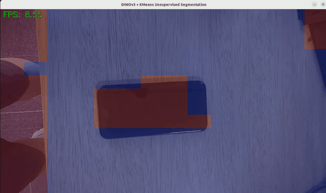 cv2.imshow('DINOv3 + KMeans Unsupervised Segmentation', overlay)