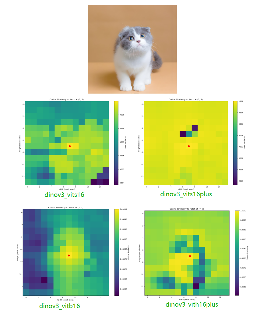本案例通过 DINOv3提取图像patch特征 ,计算指定patch与其他patch的 余弦相似性 ,生成热力图展示模型对图像空间结构的理解能力(如物体部件关联、轮廓边界等)。