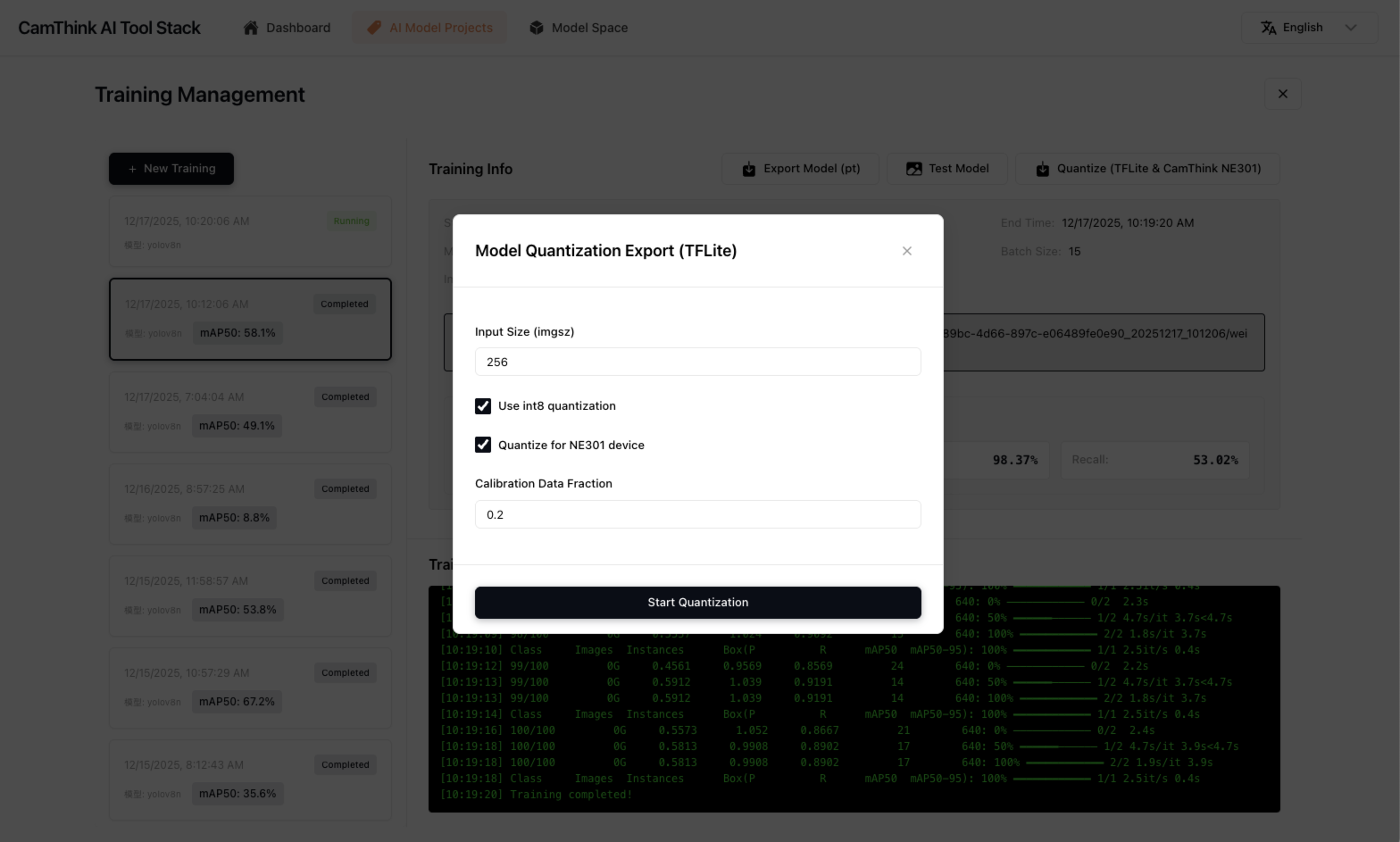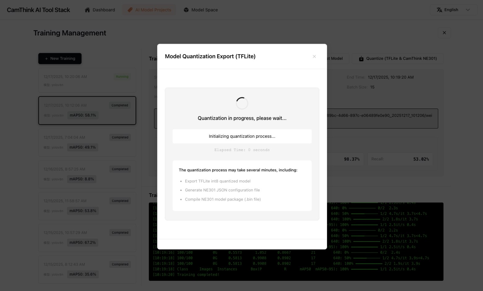 CamThink AI Camera NeoEyes NE301支持AI模型的动态部署,因此在本教程中训练完成的模型可以导出NE301可用资源包,在设备的WebUI上进行模型更新,来实现模型的边缘部署,让NeoEyes NE301具备我们我们训练的模型检测能力,来实现边缘AI的持续工作,点击可查看 NE301的硬件相关特性